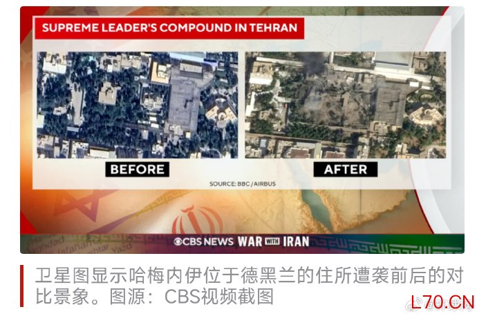 美媒发布卫星图,显示哈梅内伊住所遭袭的前后对比景象
